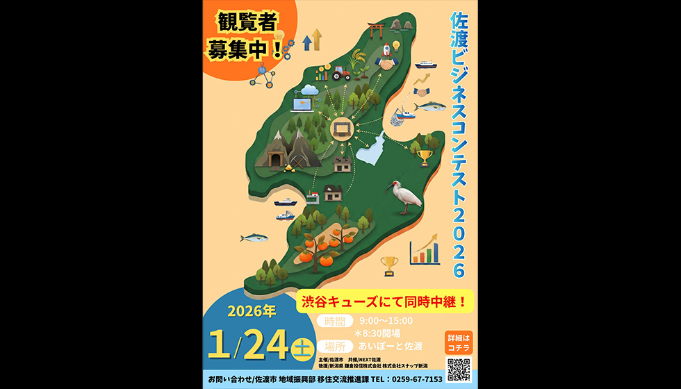「起業成功率No.1の島」を目指し、地域の課題解決に向けたビジネスプランなどを対象とした 佐渡ビジネスコンテストを開催します! 書類審査を勝ち抜いた5者からのプレゼンによる最終審査会を行いますので、 興味のある方はぜひご観覧ください★ 詳細は、募集チラシをご覧ください。 ※画像:佐渡市役所公式Xより引用いたしました。 ※情報出典:開催日以降の情報は、佐渡市役所公式Xより引用いたしました。
